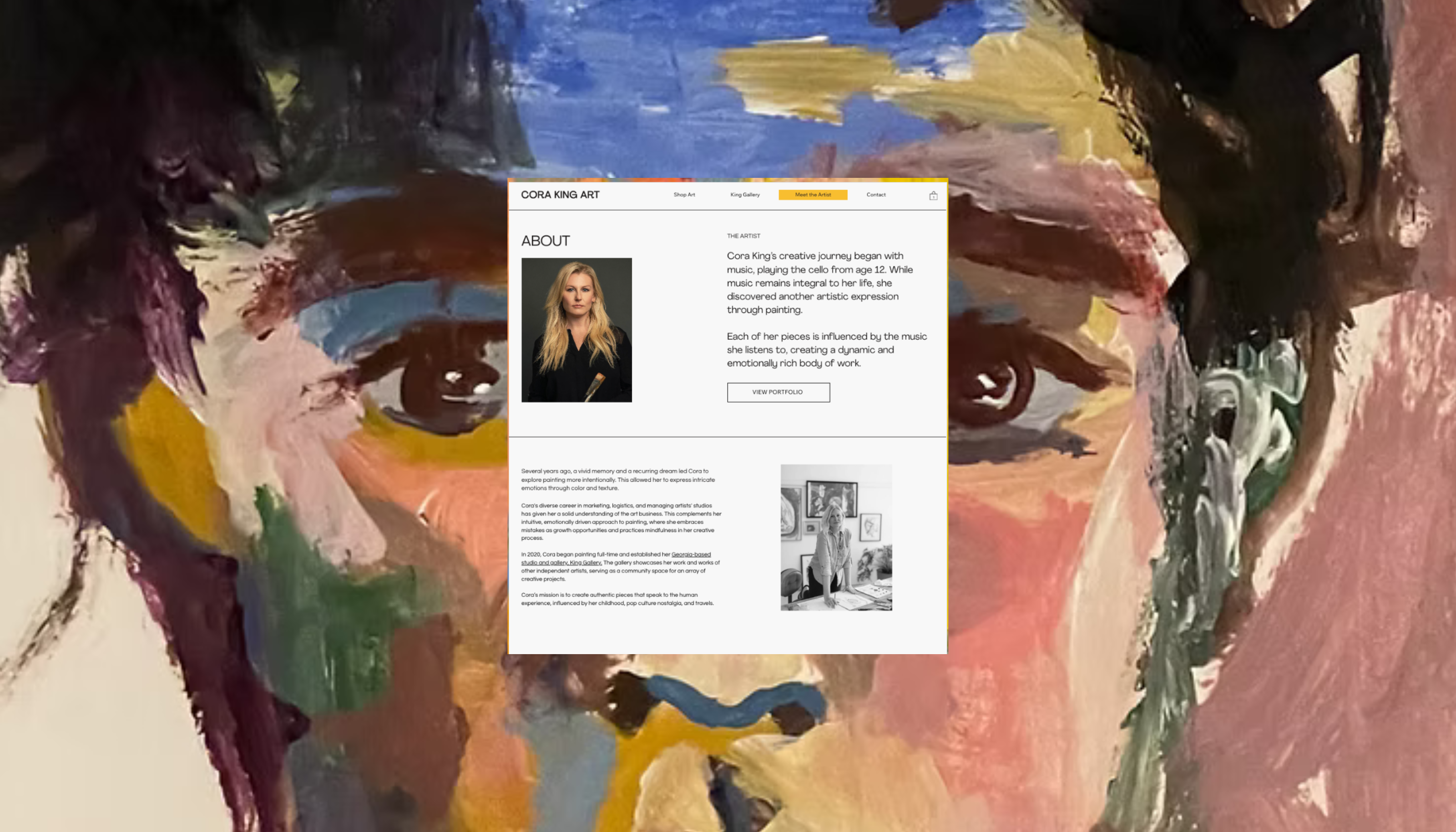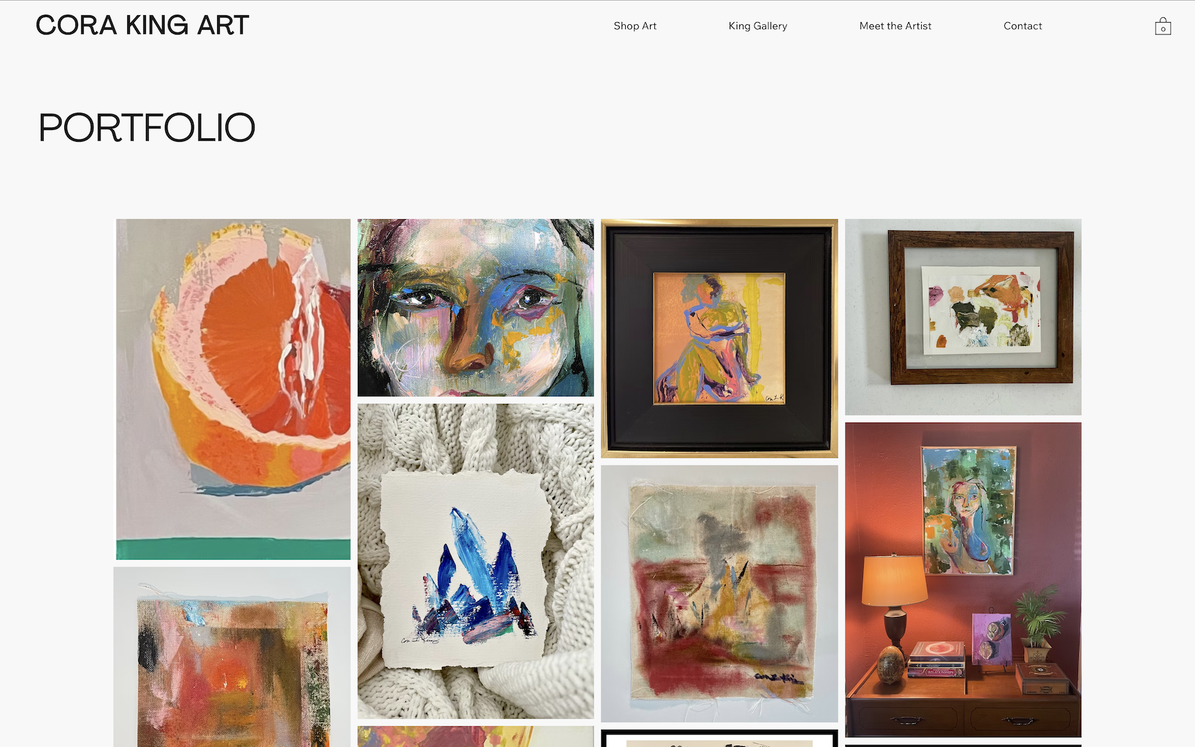 A reimagined visual idenity and website for artist Cora King and her community-driven gallery. The website presents her portfolio, shop, and gallery offerings within one cohesive system, elevating her artwork while clearly distinguishing Cora King Art from King Gallery. The site's interface design is minimal and gallery-inspired, allowing the work to lead through a clear user journey and streamlined shopping.