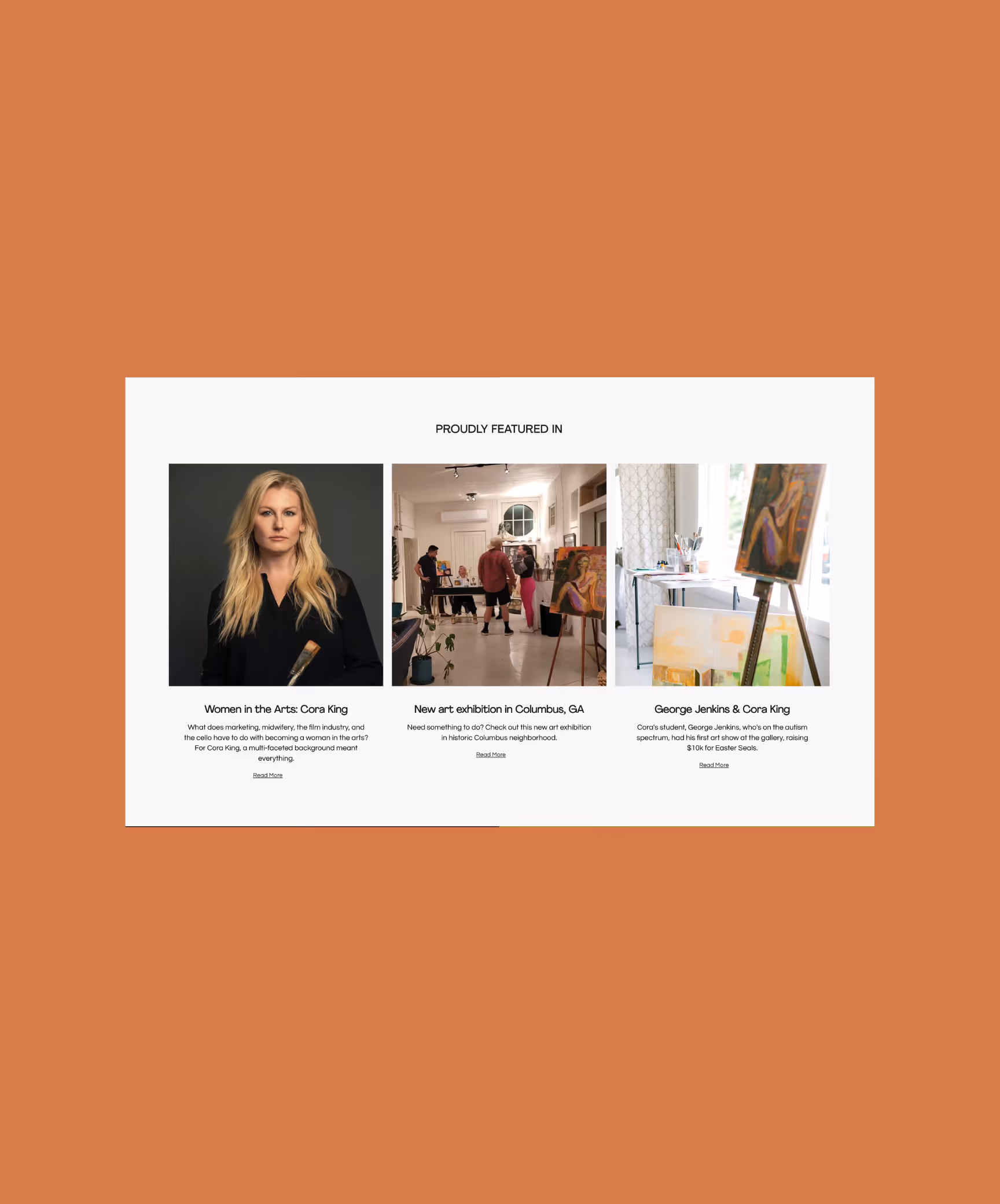 A reimagined visual identity and website for artist Cora King and her community-driven gallery. The website presents her portfolio, shop, and gallery offerings within one cohesive system, elevating her artwork while clearly distinguishing Cora King Art from King Gallery. The site's interface design is minimal and gallery-inspired, allowing the work to lead through a clear user journey and streamlined shopping.